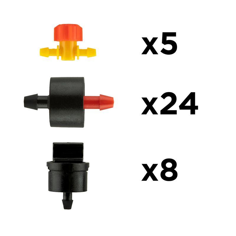 | Комплектация: | адаптер для 3/4''|адаптер для 1/2'' (быстросъемный)|шланг 20 м|адаптер на шланг|регулятор расхода воды - 5 шт.|соединитель шланга прямой - 8 шт.|соединитель шланга Т-образный - 8 шт.|капельный ороситель промежуточный - 24 шт.|капельный ороситель финальный - 8 шт.|держатель шланга - 30 шт.|упаковка, |