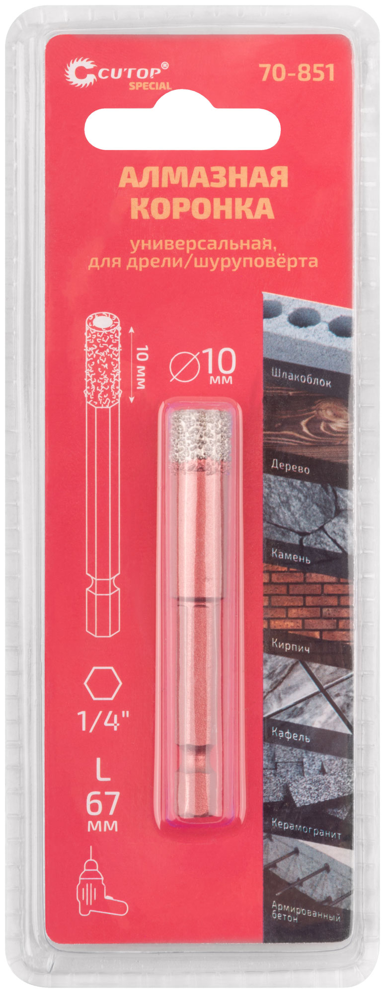 Коронка алмазная универсальная Special, шестигранный хвостовик 1/4'', 10 x 10 х 67 мм, код 70-851, производитель CUTOP