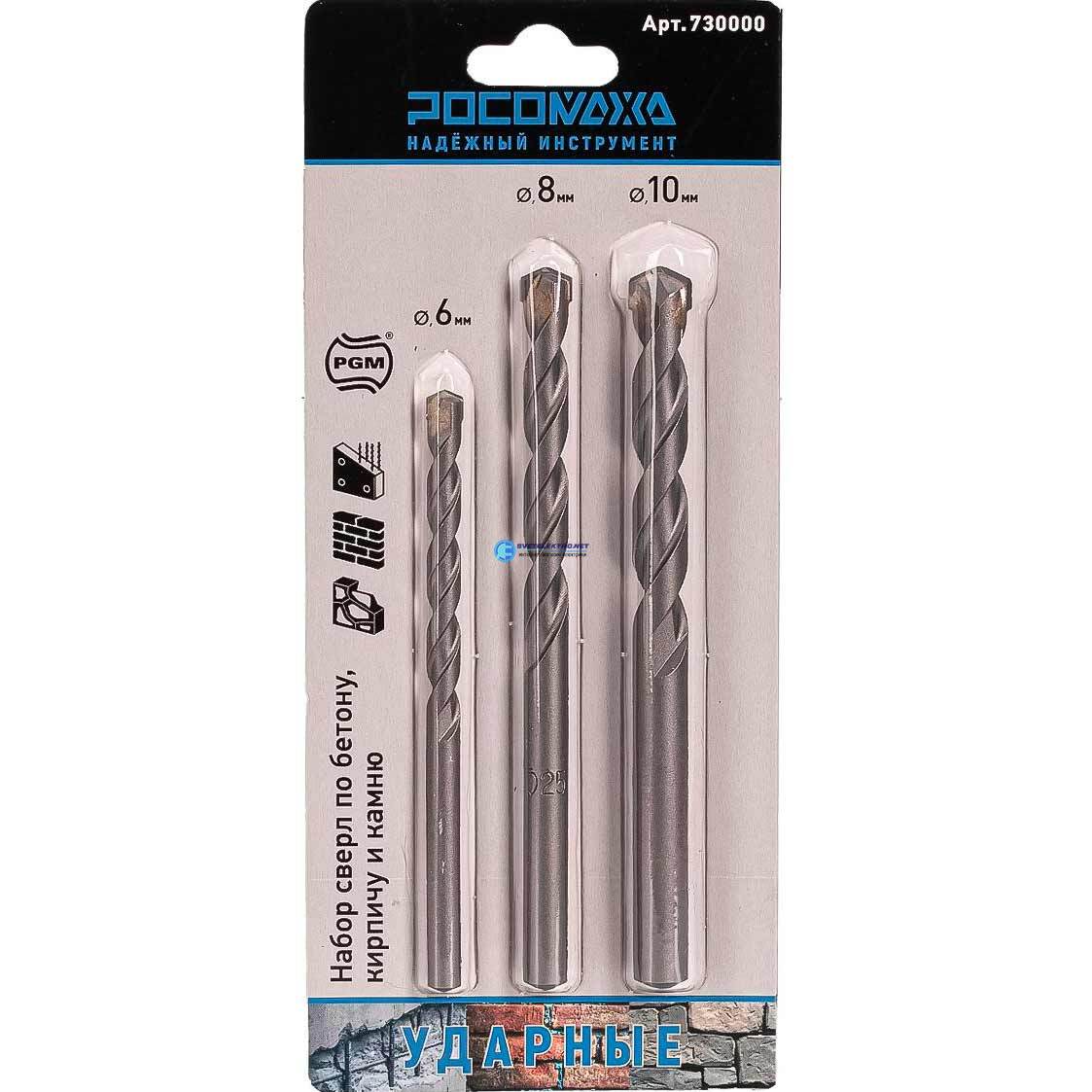 Набор ударных сверл по камню, кирпичу и бетону 6, 8, 10 мм, код 730000, производитель Росомаха