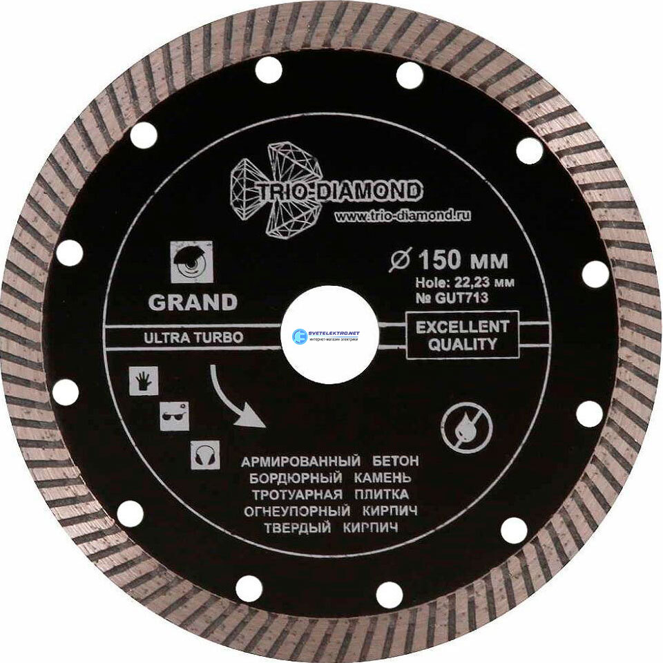 | Комплектация: | Диск алмазный отрезной 150*22,23 Турбо серия Grand hot press GUT713, |