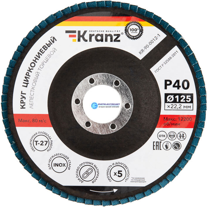 Круг лепестковый торцевой, циркониевый, P40, 125х22,2мм INOX KR-90-0012-1 Kranz