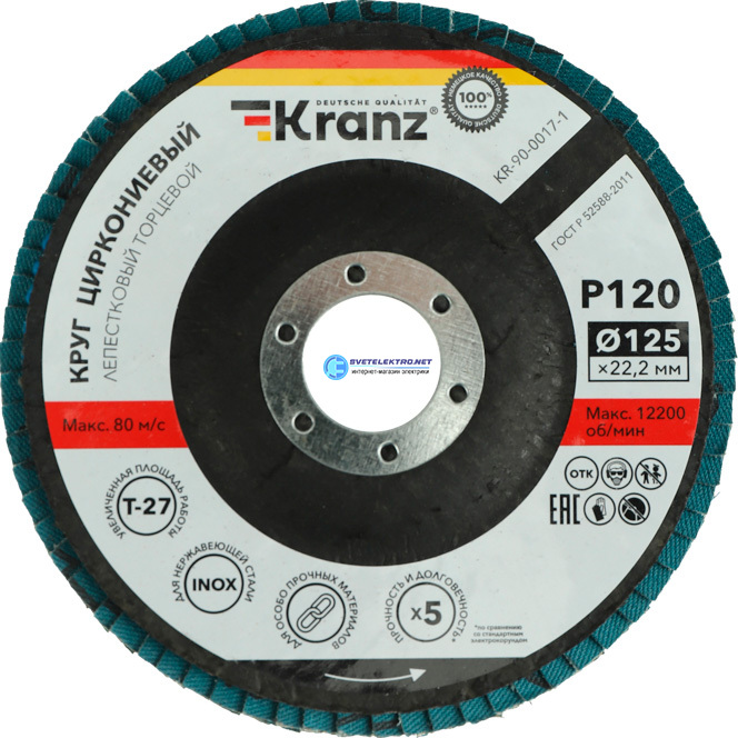 Круг лепестковый торцевой, циркониевый, P120, 125х22,2мм INOX KR-90-0017-1 Kranz
