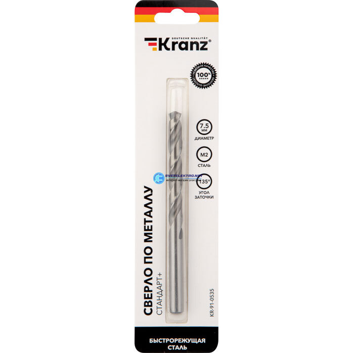 Сверло по металлу 7.5х109х69 мм (P6M5 M-2) DIN 338, код KR-91-0535, производитель Kranz