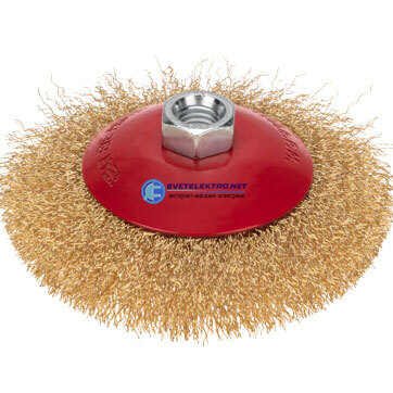 | Преимущества: | Латунированная проволока устойчива к коррозии и создает меньше искр при работе|Коническая форма позволяет легко достигать труднодоступные участки|Тип соединения М14 обеспечивает простоту и надежность установки на УШМ: |