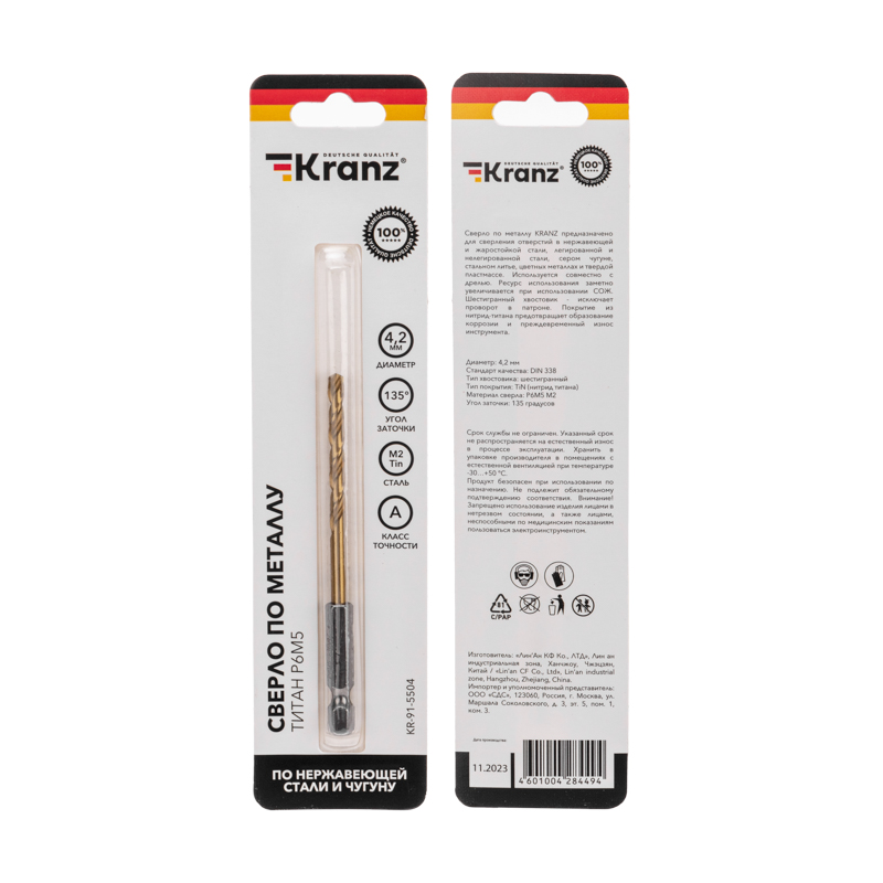 Сверло по металлу, 4,2 мм, Р6М5, ТИТАН, шестигранный хвостовик ( шт. в упаковке) DIN 338, код KR-91-5504, производитель Kranz