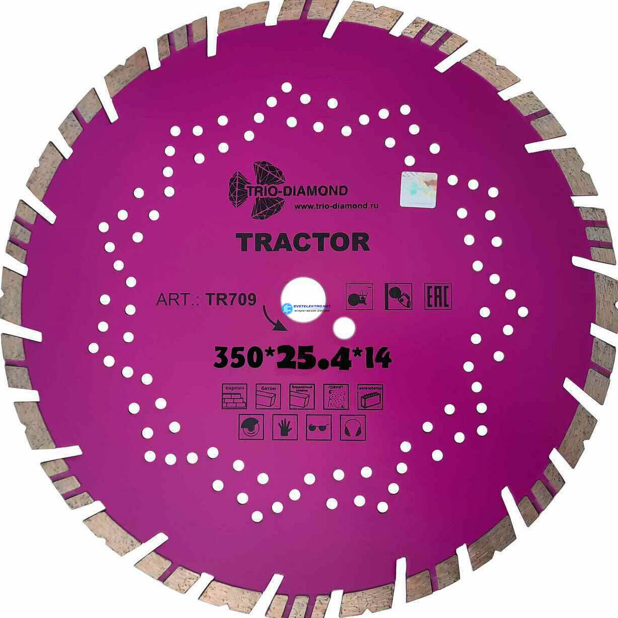| Комплектация: | Диск алмазный отрезной 350*25,4*14 серия Tractor TR709, |