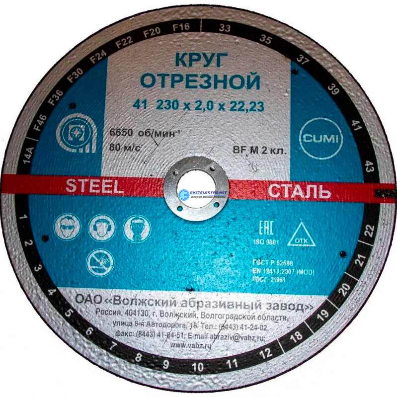 Круг отрезной 41 230х2х22,23 14А F36 39 '' BF M 6650 сталь 80 м/с УП-00219257 Волжский абразивный завод