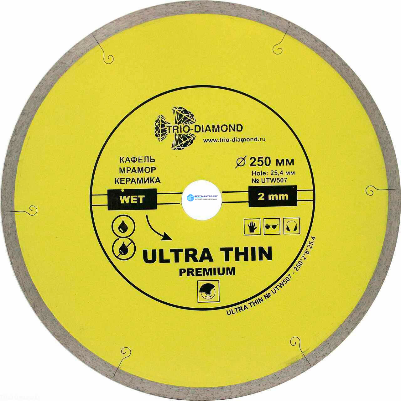 | Комплектация: | Диск алмазный отрезной 250*25,4 Сплошной ультратонкий hot press UTW507, |