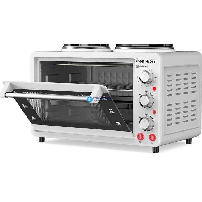 | Дополнительная информация: | Внутренний объём 26 л, Термостат с диапазоном температур 60-250?С, Выбор режима нагрева - верх, низ, 2 конфорки, 150 мм и 180 мм, Индикатор работы, Металлическая решетка, противень, ручка для противня, Мощность 1400 Вт, Мощность конфорок 1000 Вт и 700 Вт, Цвет белый: |