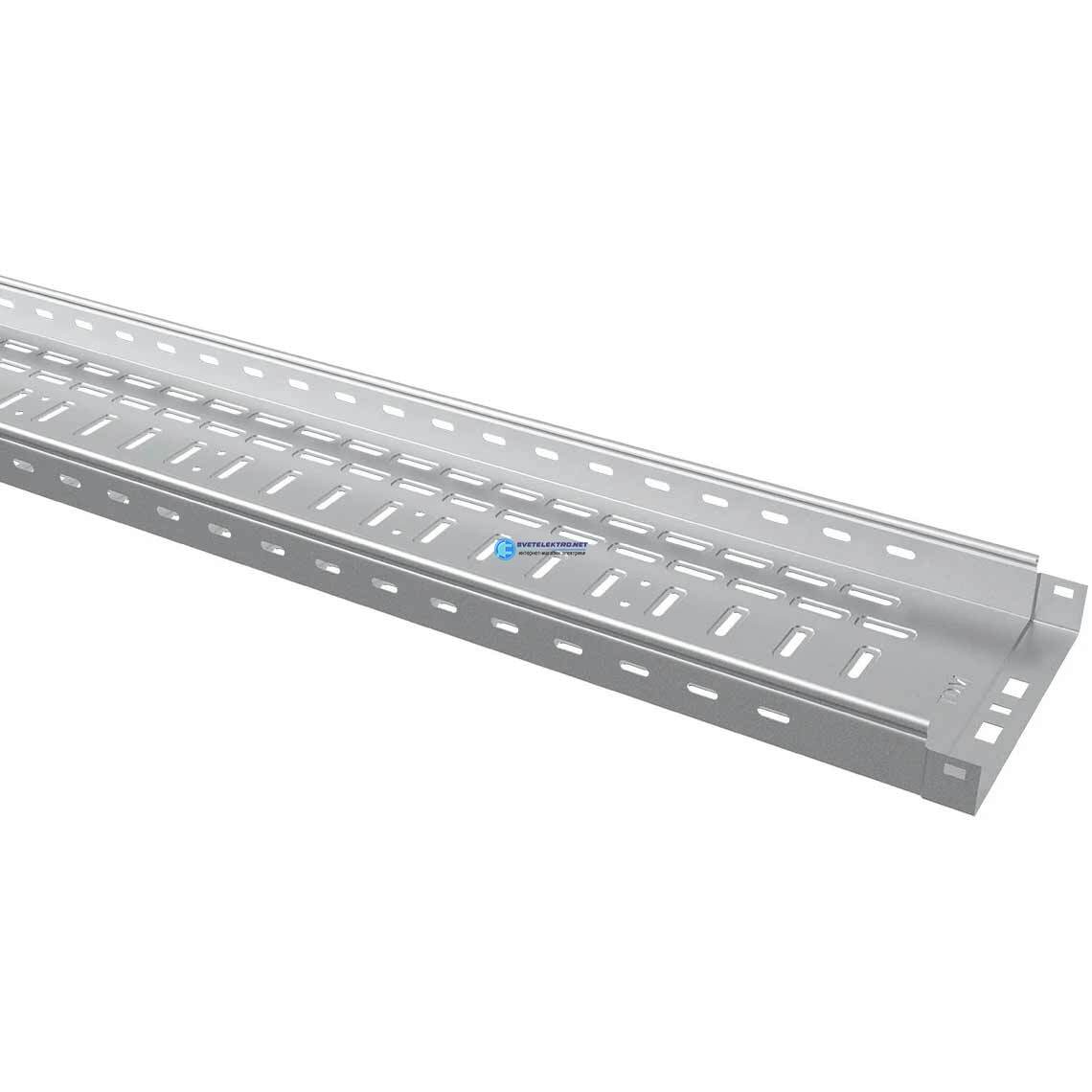 | Преимущества: | Предварительная ''безвинтовая'' фиксация при соединении встык, что способствует уменьшению времени монтажа и делает монтаж удобным | Цельный телескопический разъём ''папа-мама'' | Замковое соединение крышки с лотком | Объёмная продольная и поперечная перфорация (увеличение несущей способности на 35%): |