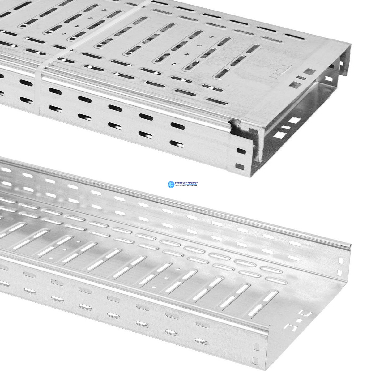 | Преимущества: | Предварительная ''безвинтовая'' фиксация при соединении встык, что способствует уменьшению времени монтажа и делает монтаж удобным | Цельный телескопический разъём ''папа-мама'' | Замковое соединение крышки с лотком | Объёмная продольная и поперечная перфорация (увеличение несущей способности на 35%): |