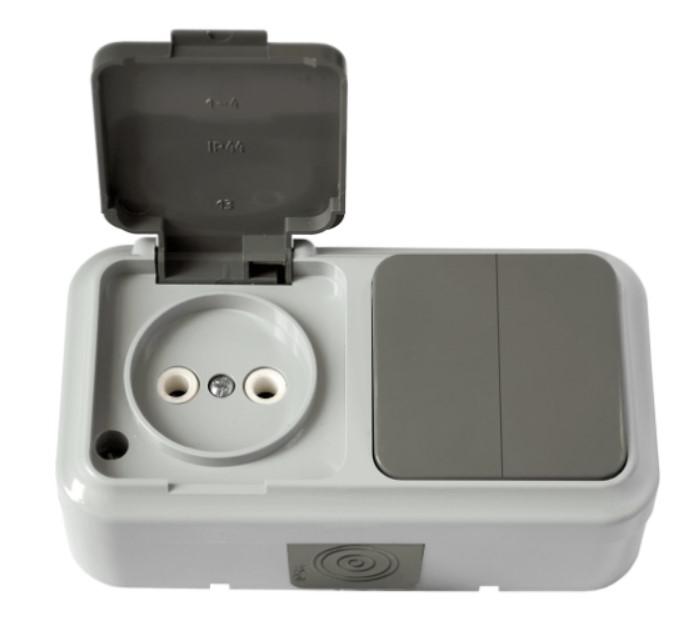 Беларусь Блок выключатель двухклавишный+розетка наружный IP54, код 2В-РЦ-655(03), производитель БелТИЗ