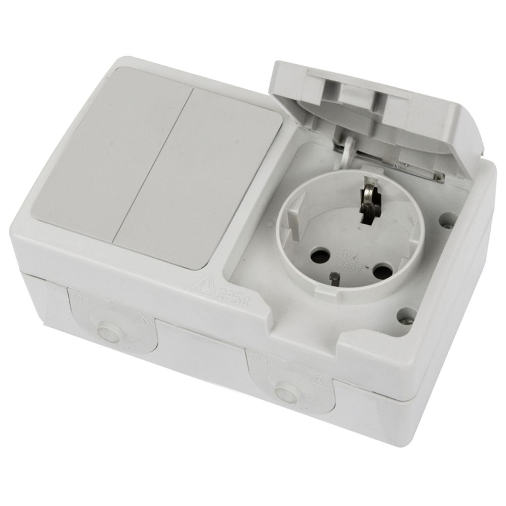 Блок розетка 1-мест с/з 250В 16А+выкл 2-клав 1-полюс для 2-х цепей 250В 10А белый/серый, код PST16-21-54/10-221-54 49729, производитель Stekker
