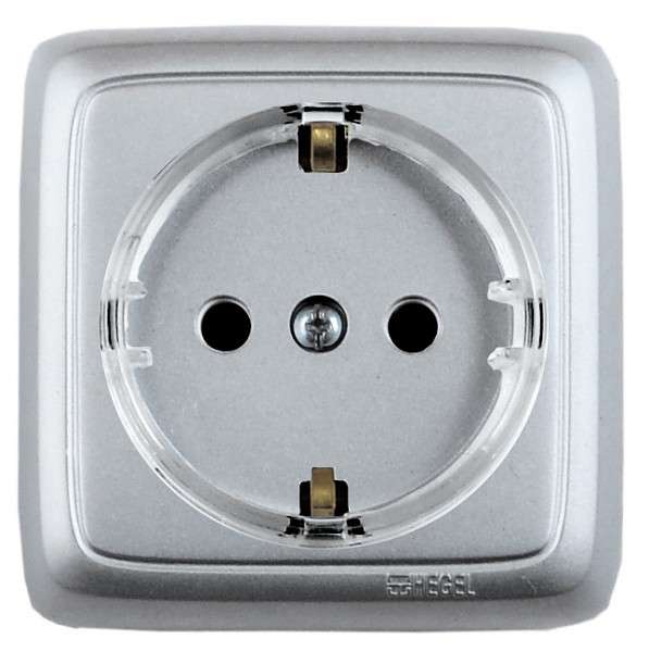 Розетка наружная с заземлением с изоляционной пластиной со шторками (стакан) серебро РА16-174-06 HEGEL