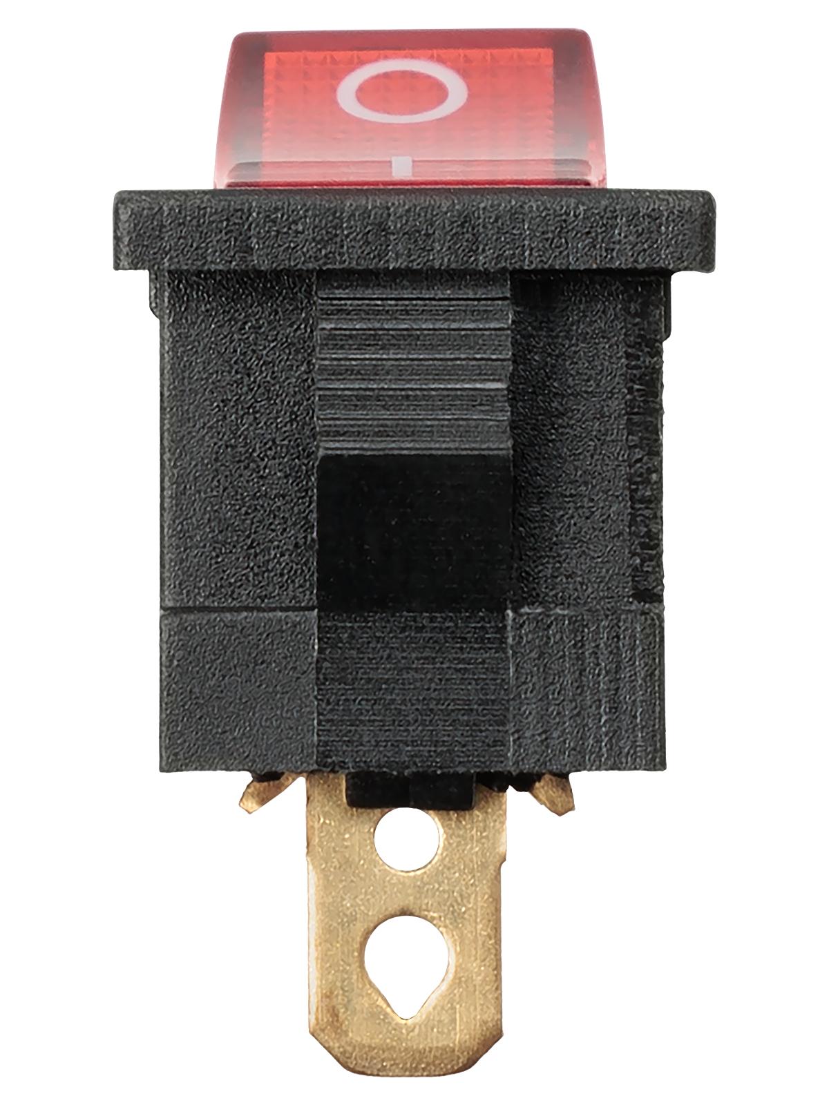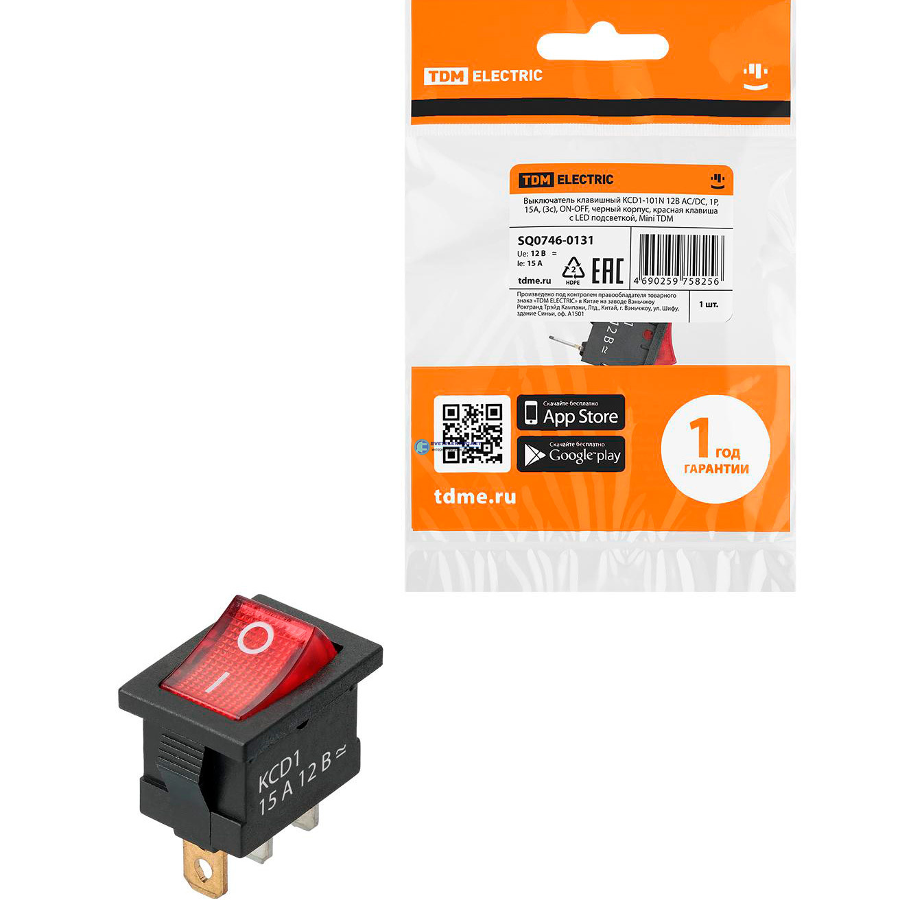 Выключатель клавишный KCD1-101N 12В AC/DC, 1P, 15А, (3с), ON-OFF, черный корпус, красная клавиша с LED подсветкой, Mini, код SQ0746-0131, производитель TDM