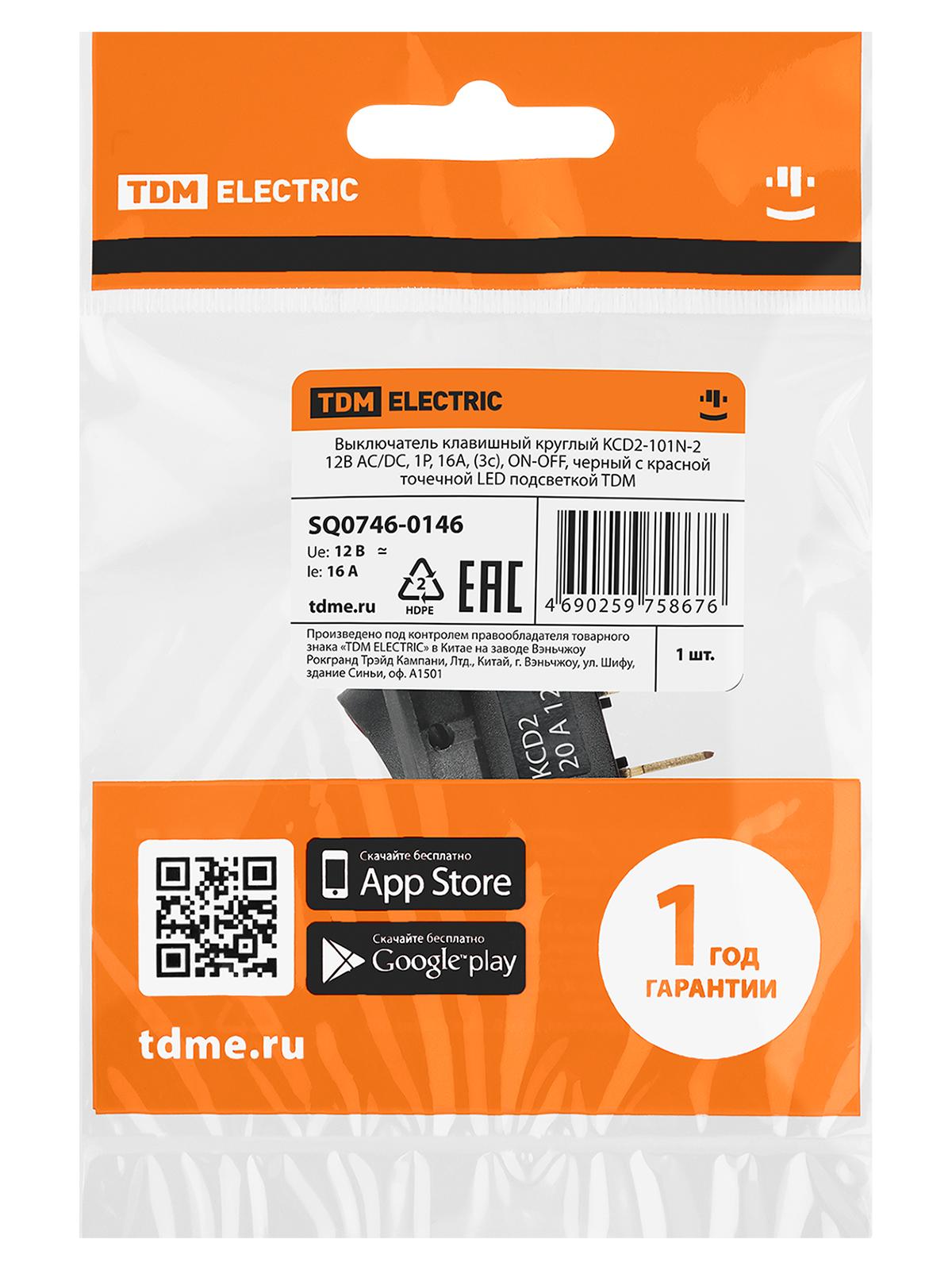 Выключатель клавишный круглый KCD2-101N-2 12В AC/DC, 1P, 16А, (3с), ON-OFF, черный с красной точечной LED подсветкой, код SQ0746-0146, производитель TDM