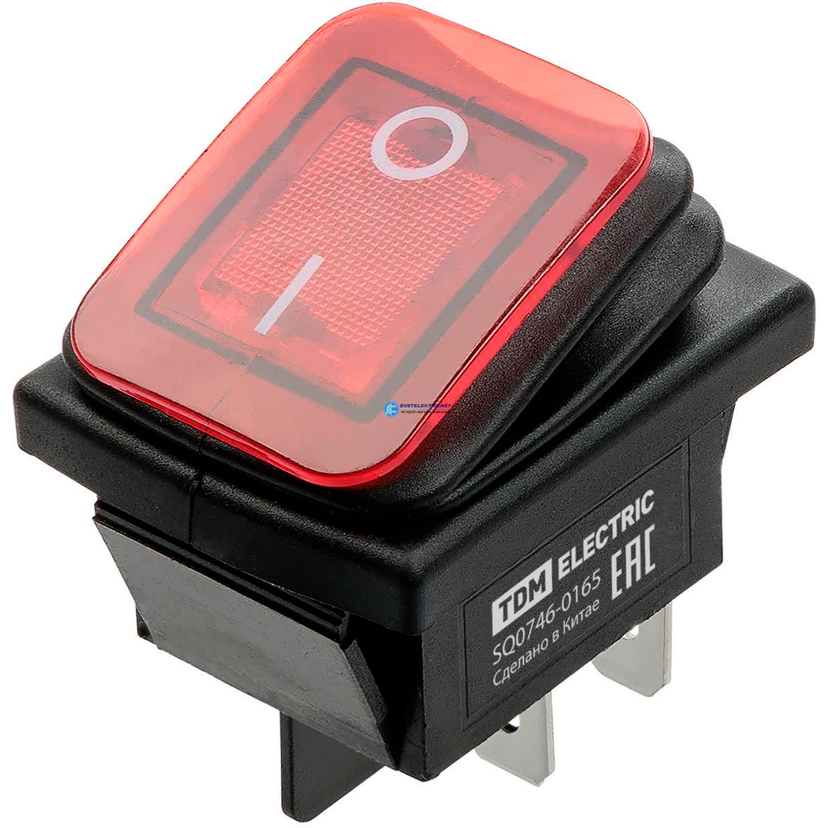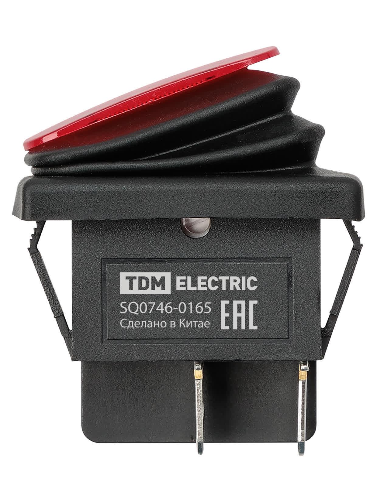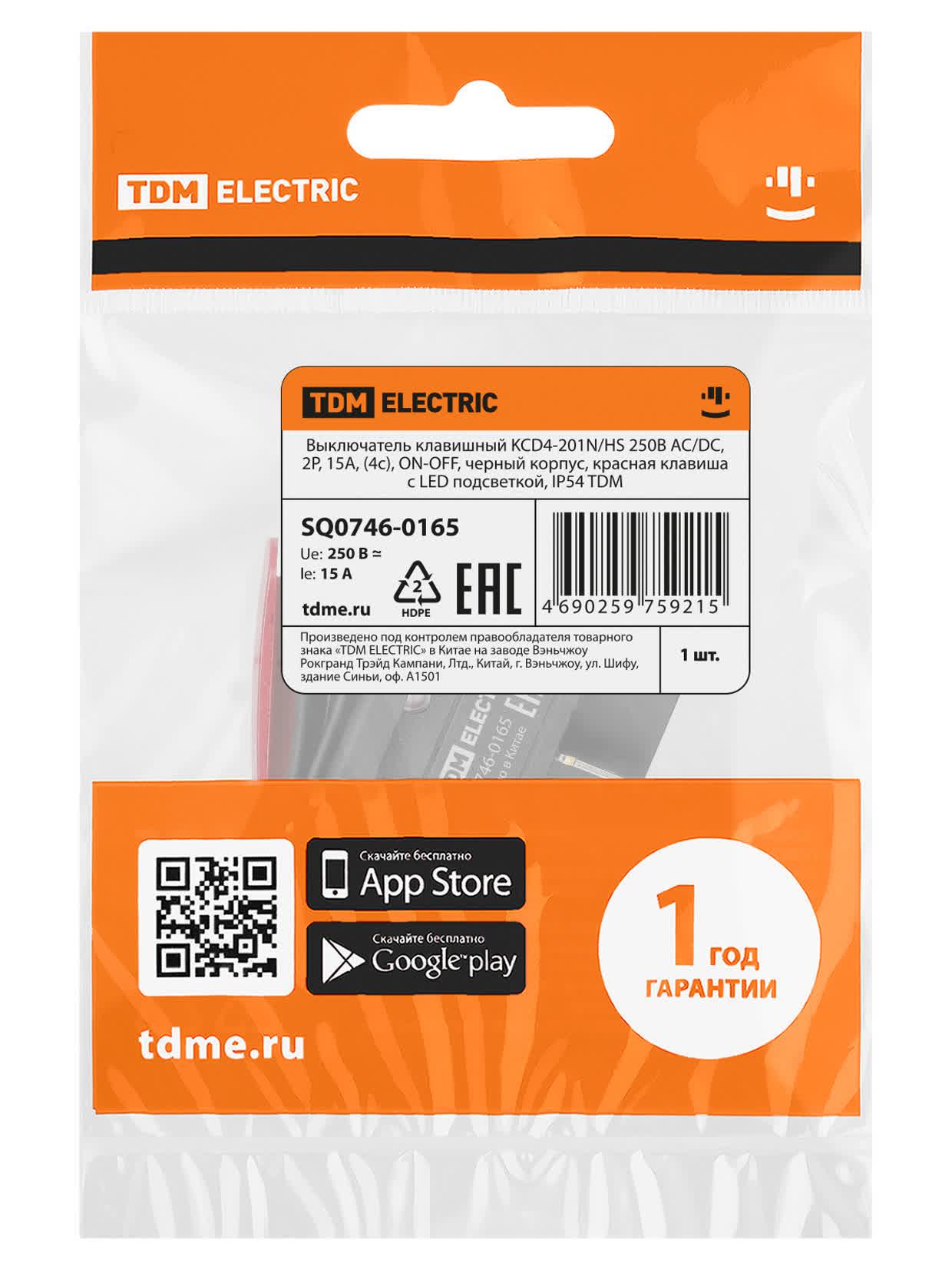 Выключатель клавишный KCD4-201N/HS 250В AC/DC, 2P, 15А, (4с), ON-OFF, черный корпус, красная клавиша с LED подсветкой, IP54, код SQ0746-0165, производитель TDM