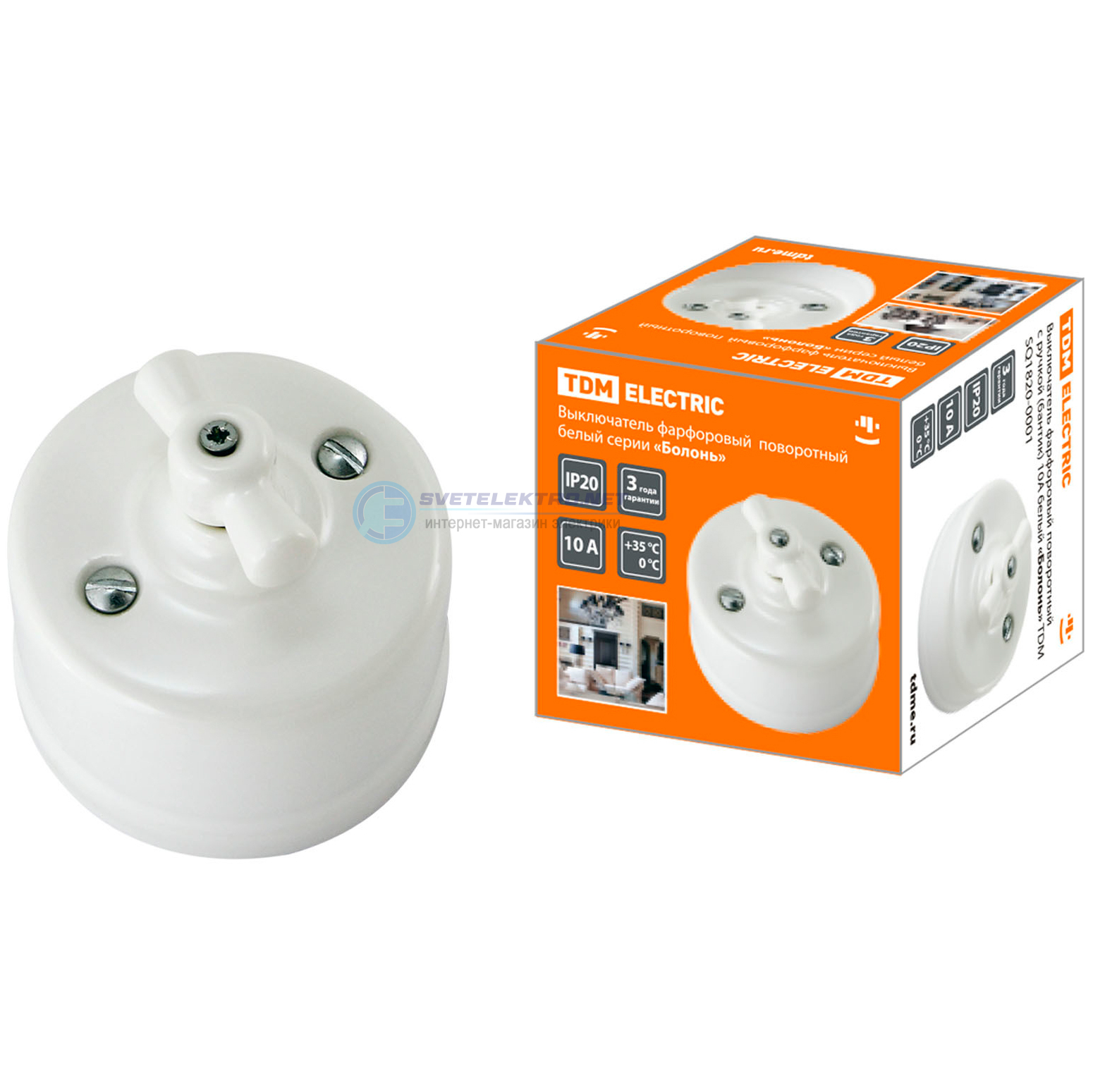 Выключатель скрытой установки фарфоровый поворотный проходной с ручкой (бантик) 10А белый «Болонь», код SQ1820-0014, производитель TDM