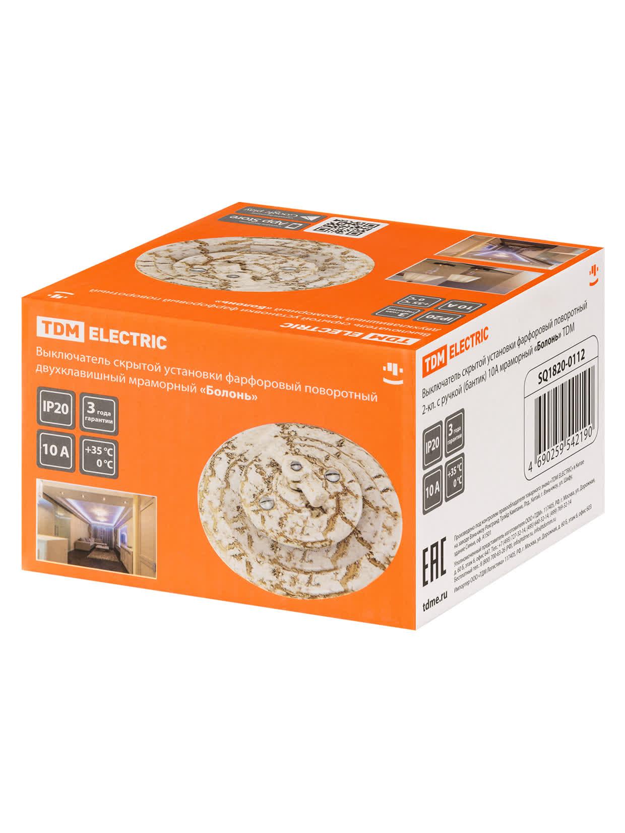 Выключатель скрытой установки фарфоровый поворотный 2-кл. с ручкой (бантик) 10А мраморный «Болонь», код SQ1820-0112, производитель TDM